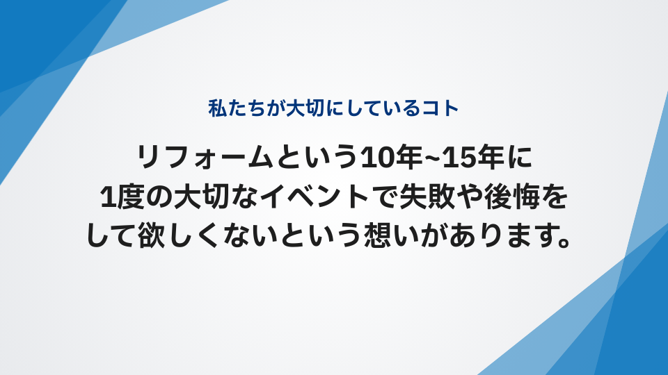 リフォームは人生の中でも大きな決断です。ですので、その決断に少しでも寄り添っていける会社でありたい。