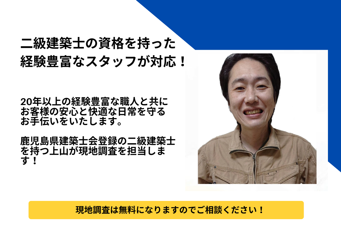 ※強風や大雪の被害を受けた鹿児島県の雨漏りのお客様からお問い合わせが増えておりますが、最短即日で対応可能です。 現在、人員を増やして対応しておりますがお電話に出れない可能性が高いです。